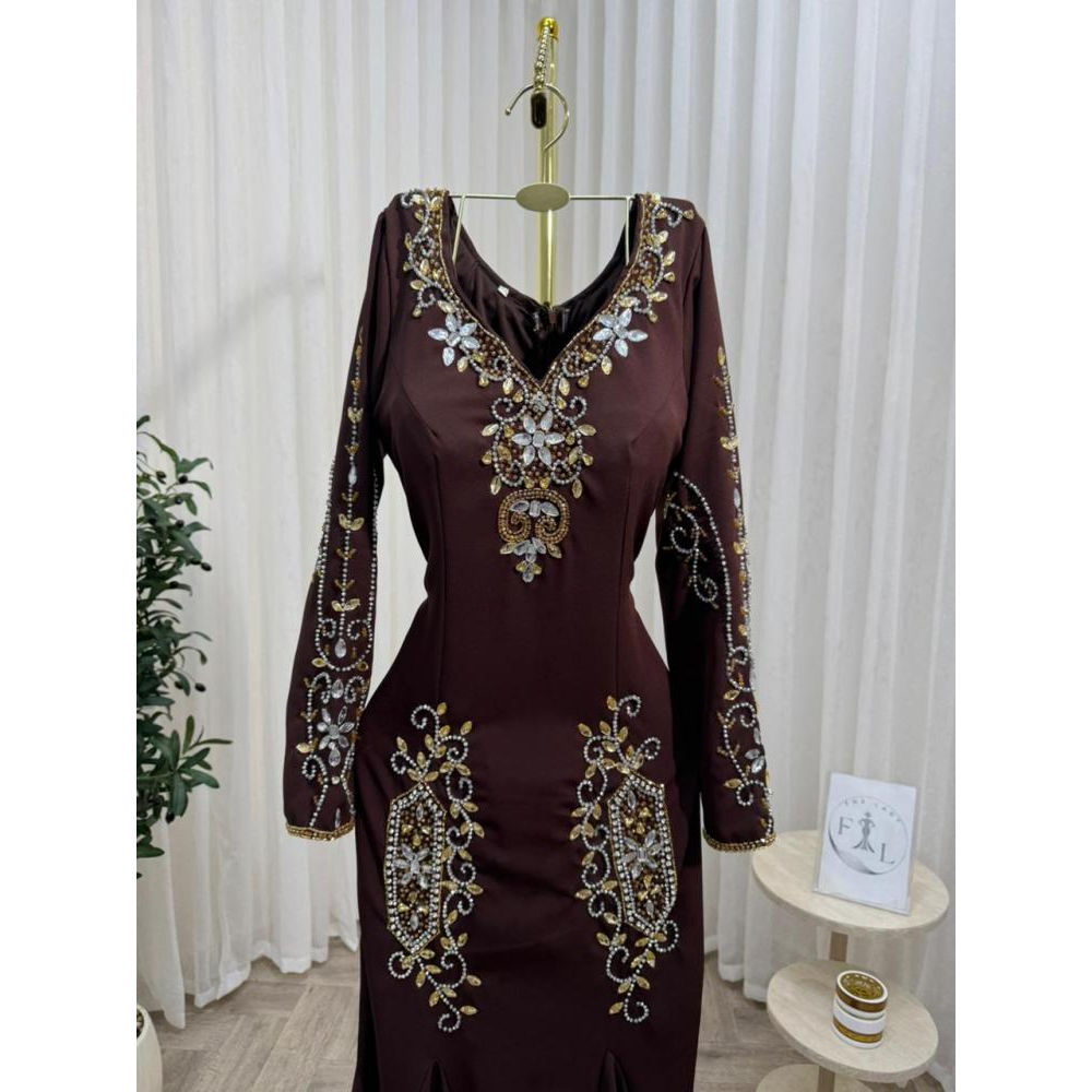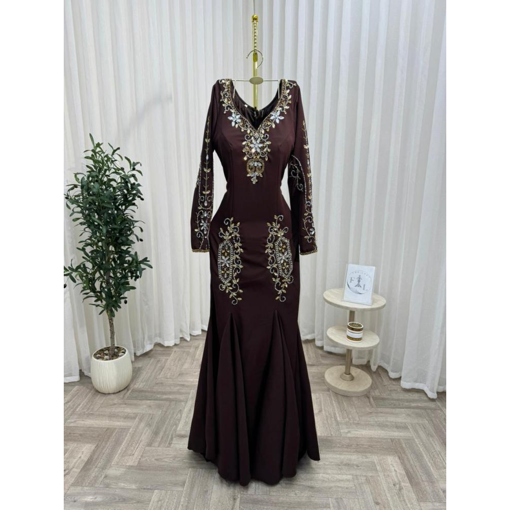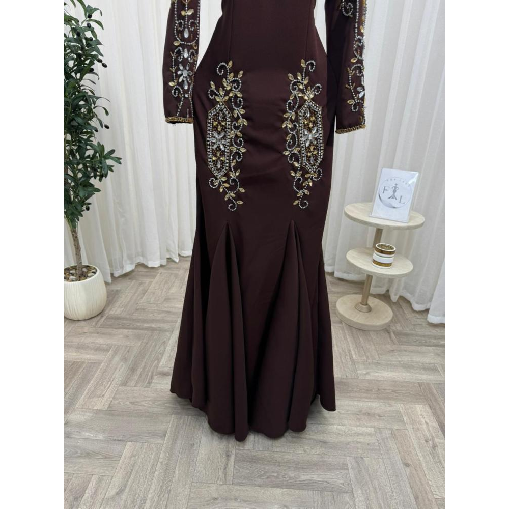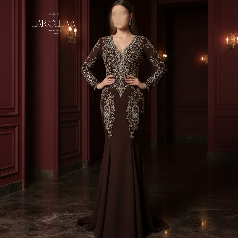 فساتين سهره بني من larellaa يجمع بين التصميم الانسيابي وفخامة التطريز اليدوي، مع لمسات الشيفون الجانبية التي تمنحك حضوراً ملكياً في أرقى المناسبات المسائية.