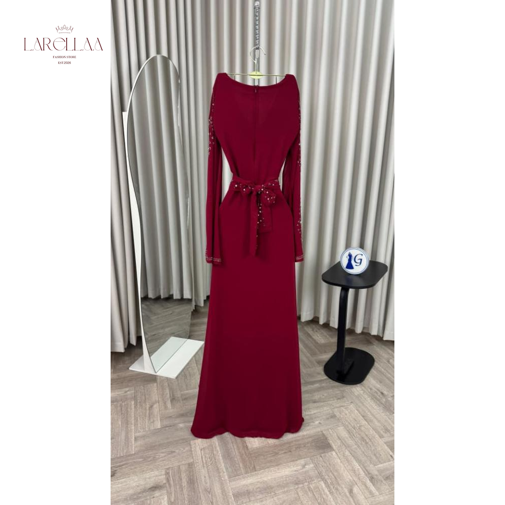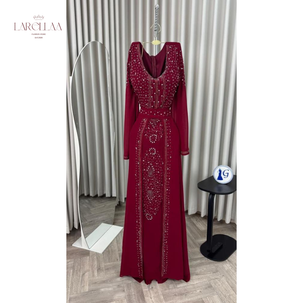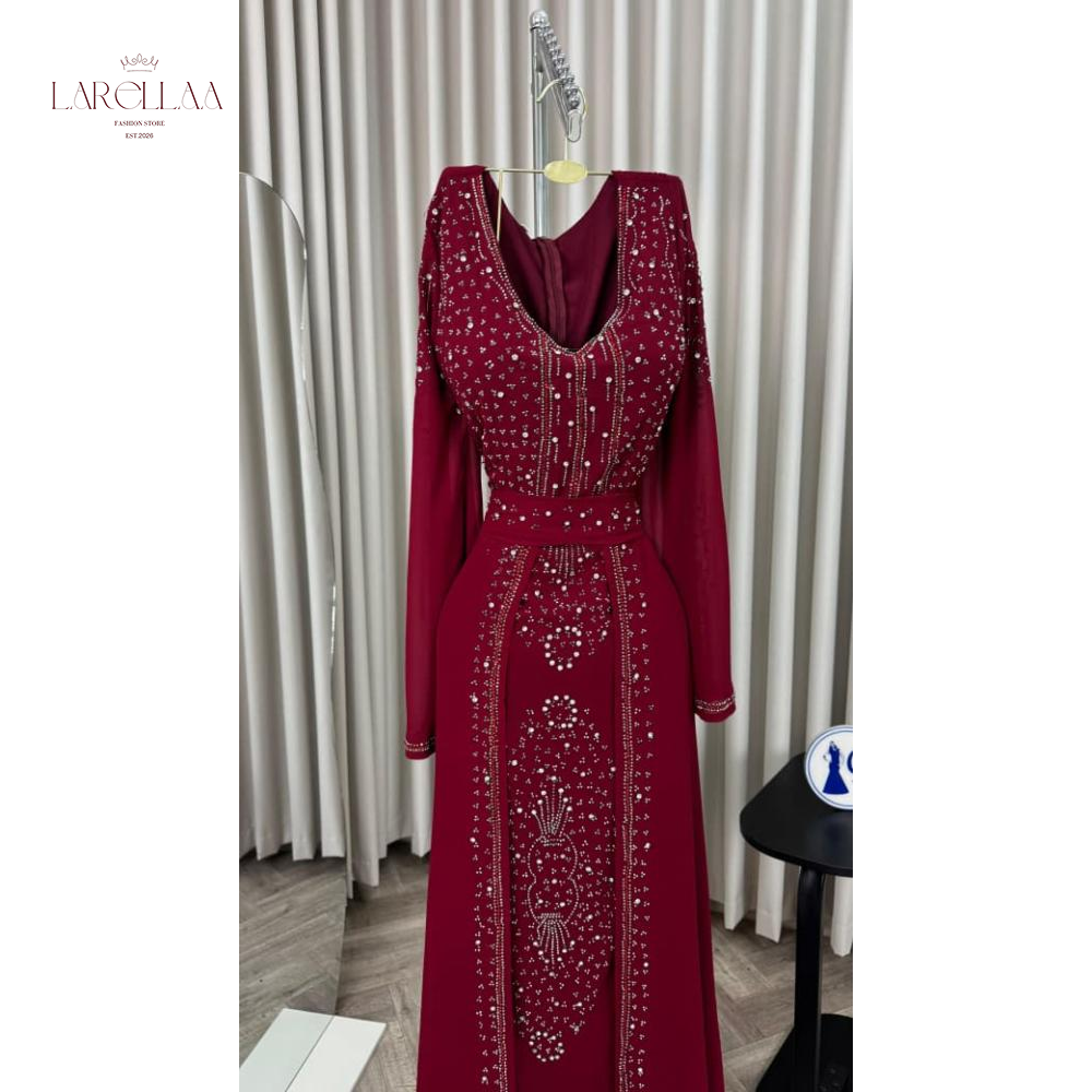 فستان احمر فخم من larellaa. يمنحكِ هذا التصميم حضوراً ملكياً يفيض بالأناقة بفضل نقشات الخرز والترتر التي تغطي الصدر والأكمام وتمتد بانسيابية على التنورة.