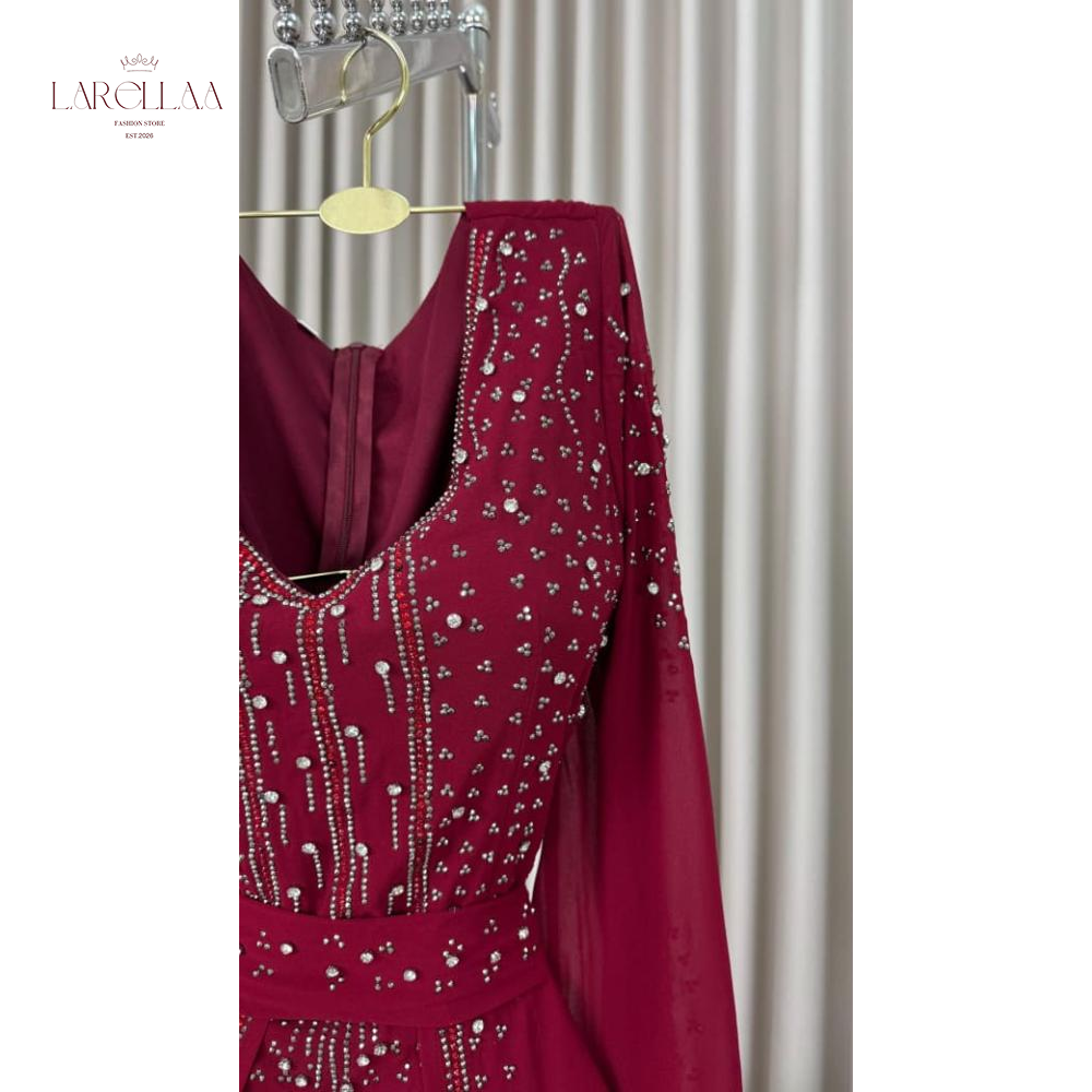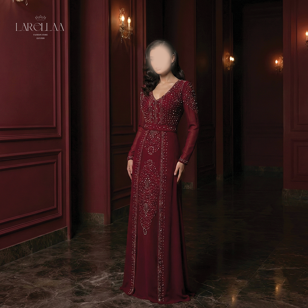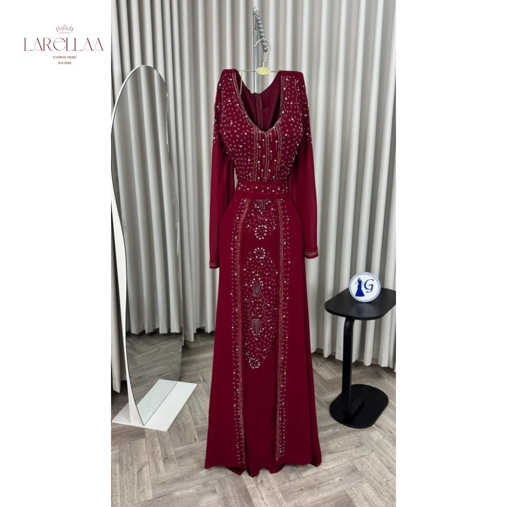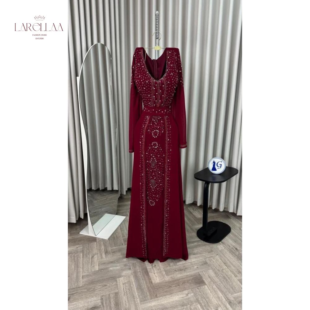 فستان احمر فخم من larellaa. يمنحكِ هذا التصميم حضوراً ملكياً يفيض بالأناقة بفضل نقشات الخرز والترتر التي تغطي الصدر والأكمام وتمتد بانسيابية على التنورة.