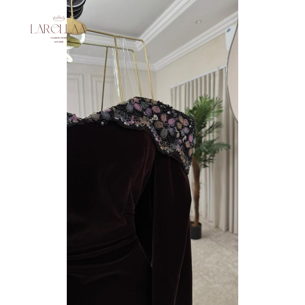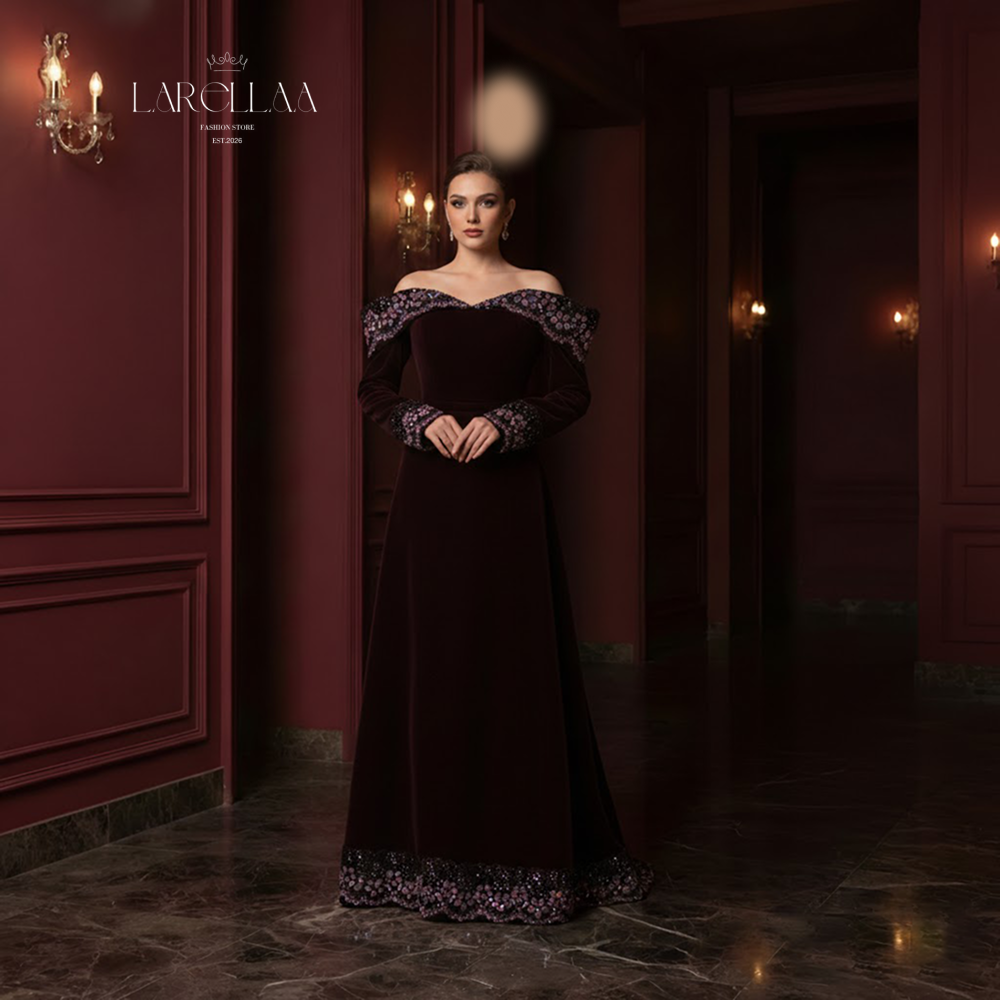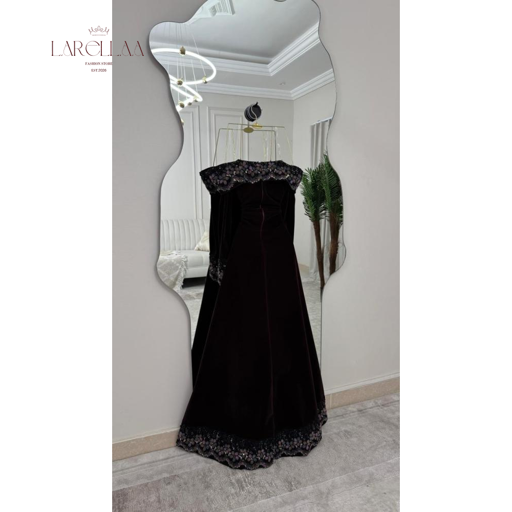 فستان اسود قطيفه من larellaa يعكس الأناقة والرفاهية، مع تفاصيل تطريز دقيقة تمنحك إطلالة مميزة في المناسبات الرسمية.