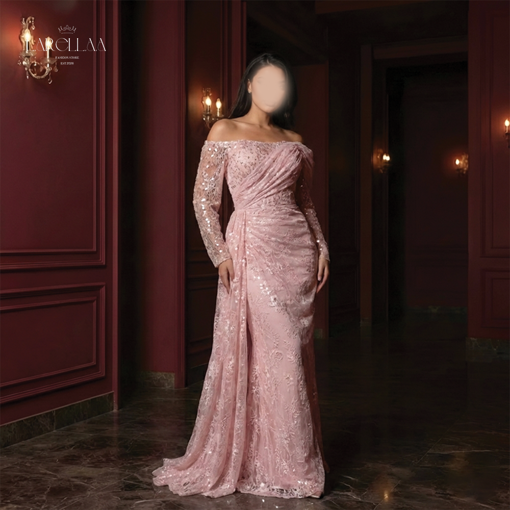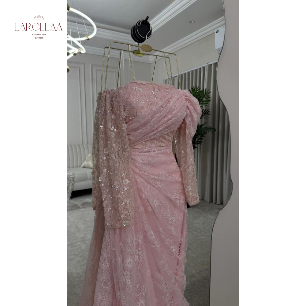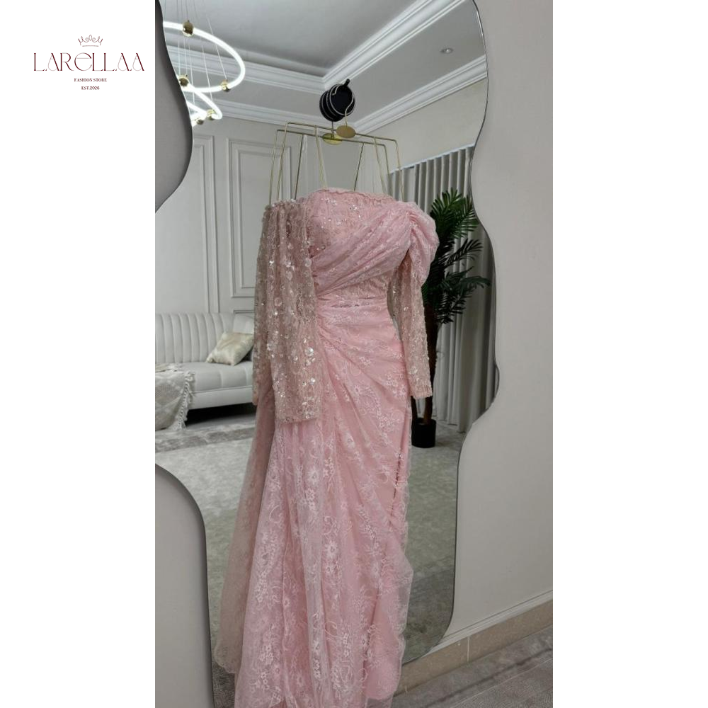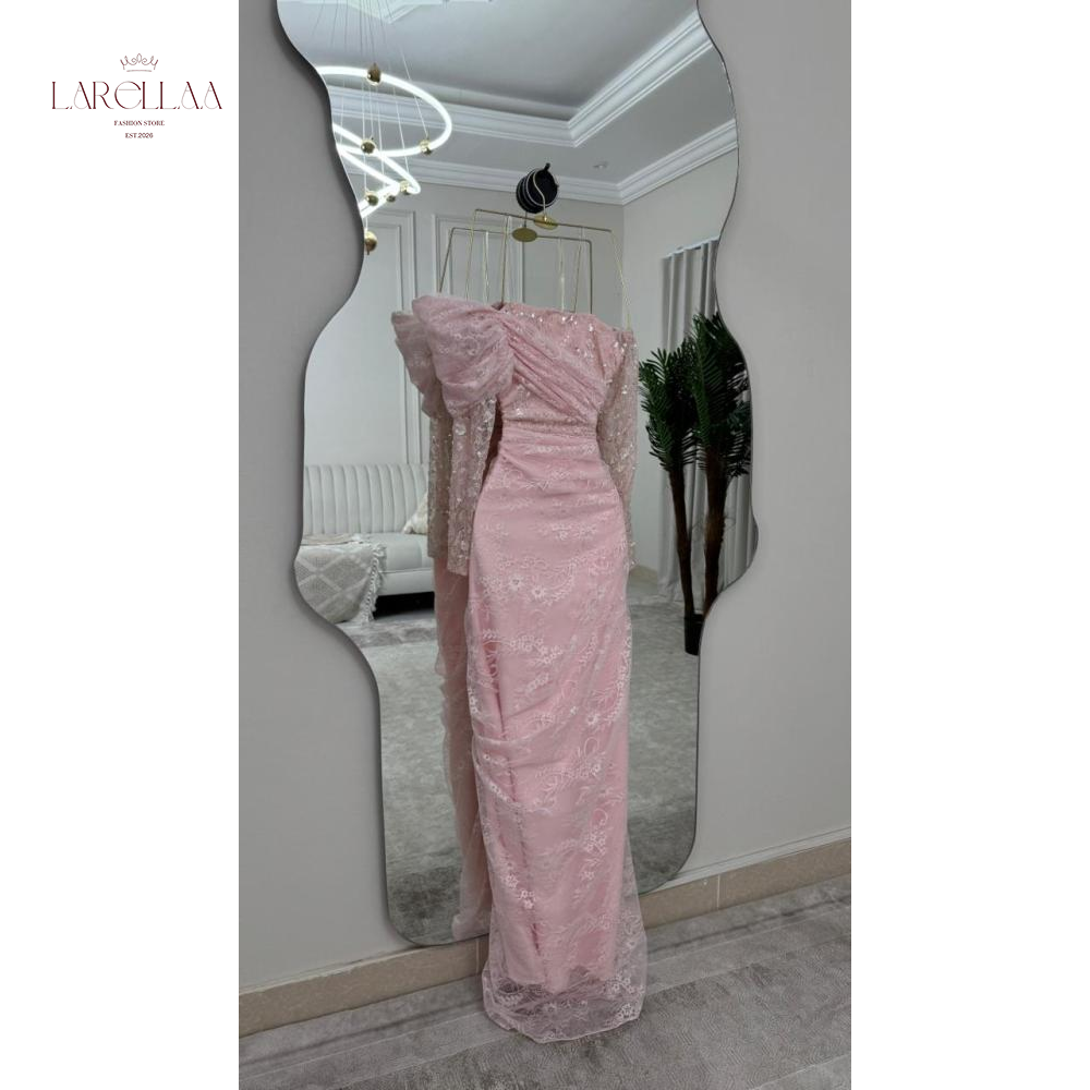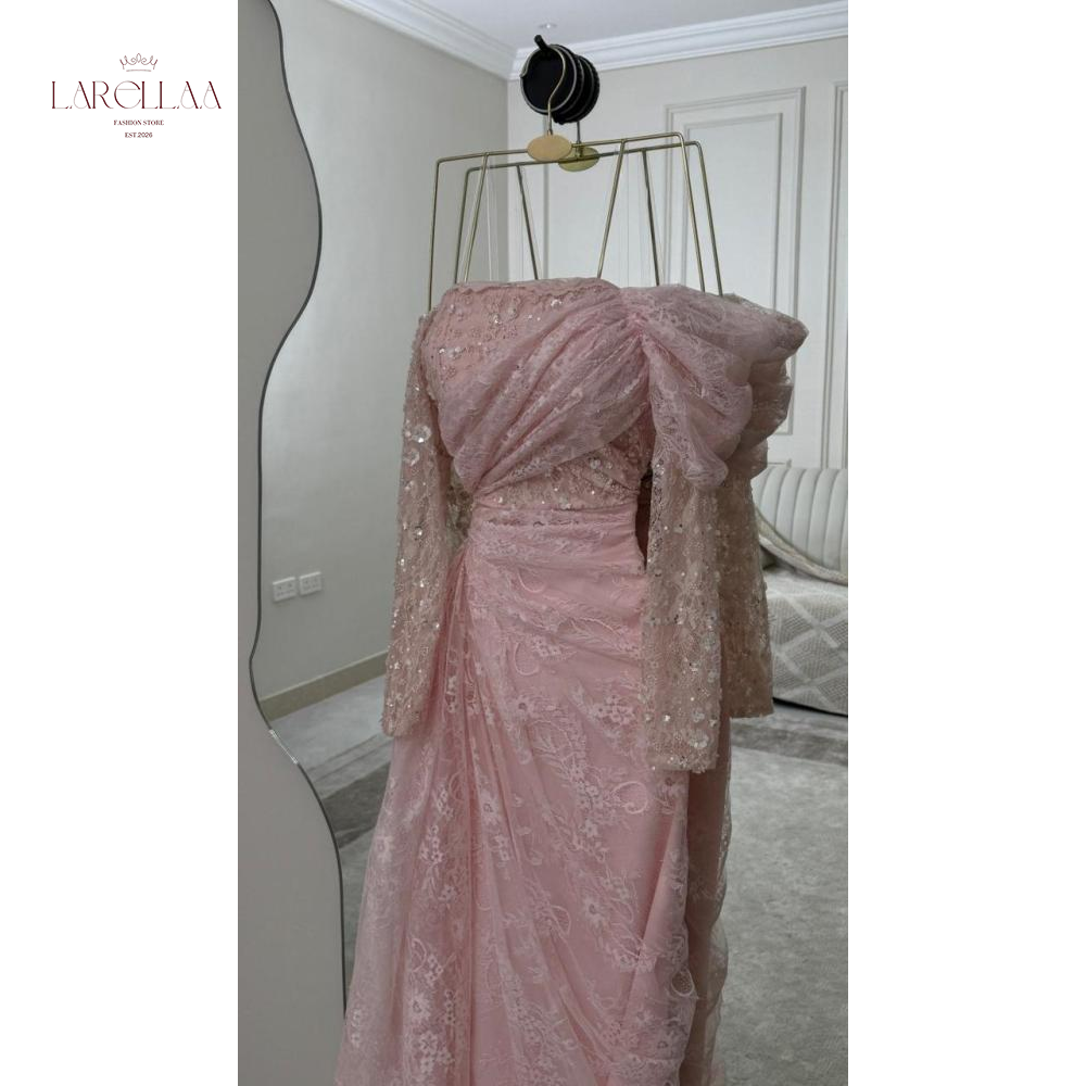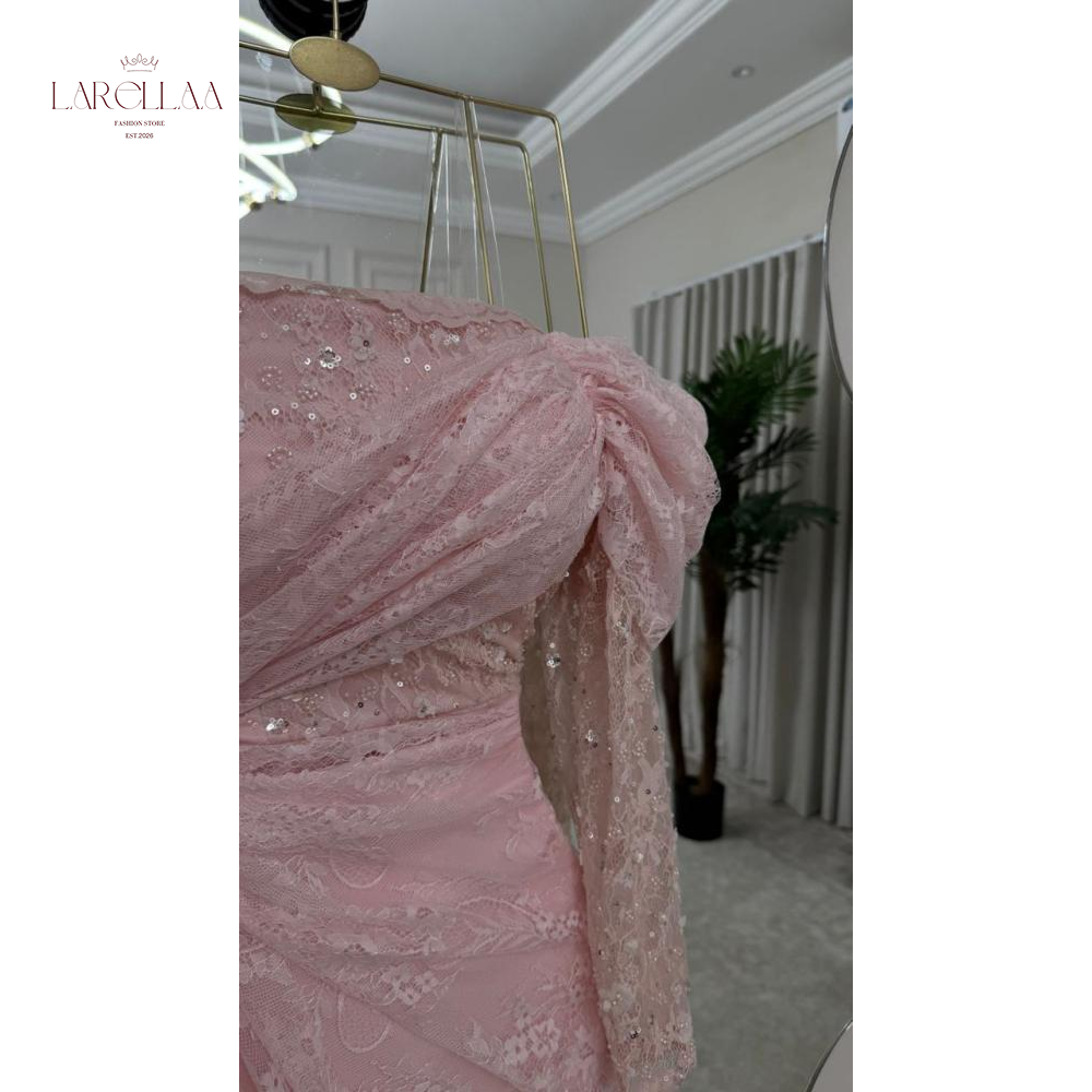 فستان بمبي فاتح من larellaa، الذي يجسد الرقة العصرية بفضل نسيج الدانتيل الفاخر، المصمم ليمنحك إطلالة حالمة ومشرقة في أرقى مناسباتك.