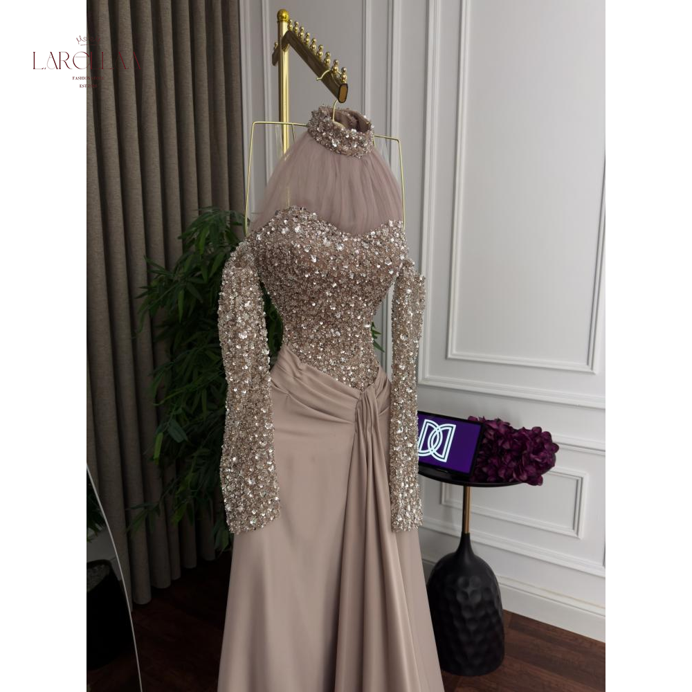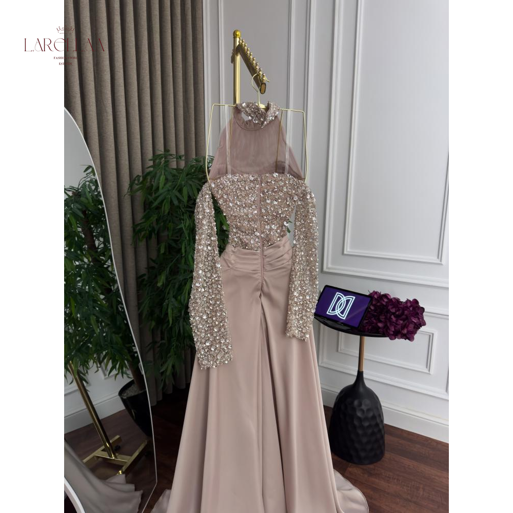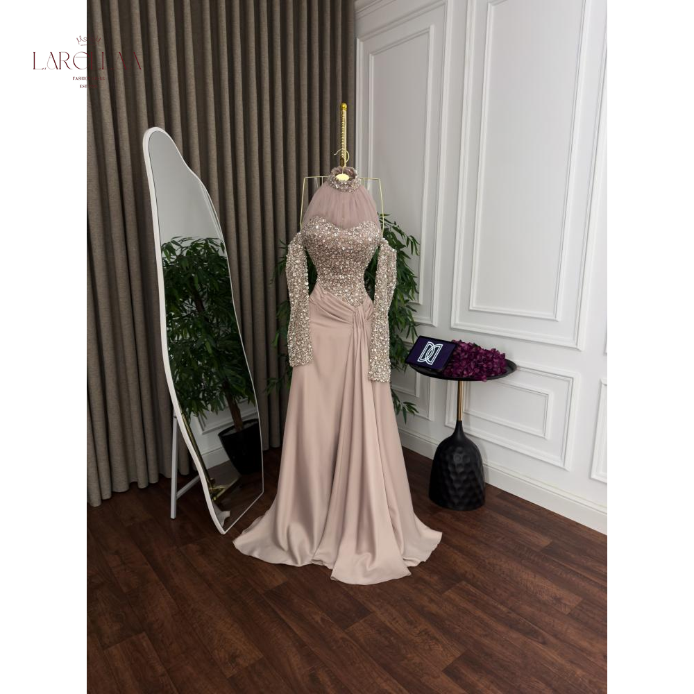 فستان سهرة بيج من larellaa يتميز بتصميمه الراقي ذو الرقبة العالية والأكمام الطويلة، والمزين بحبات اللؤلؤ المشغولة بدقة لتمنحك حضوراً استثنائياً في أرقى المناسبات الرسمية.