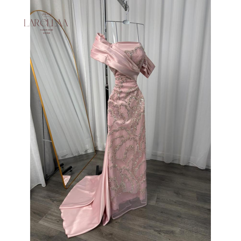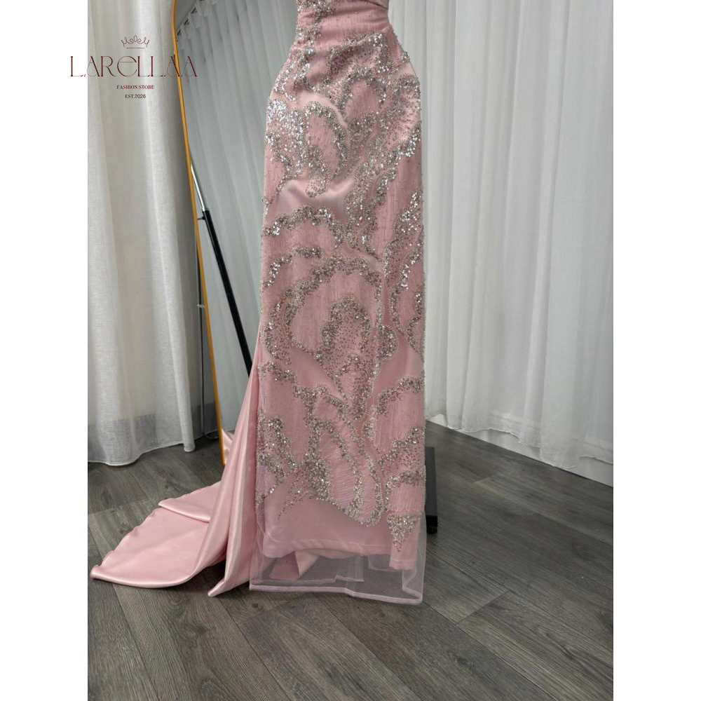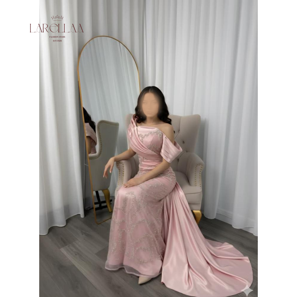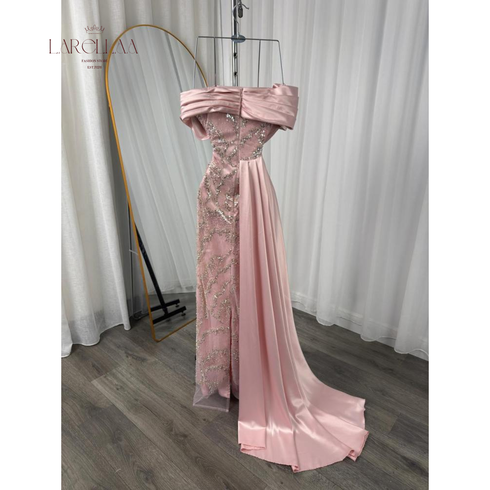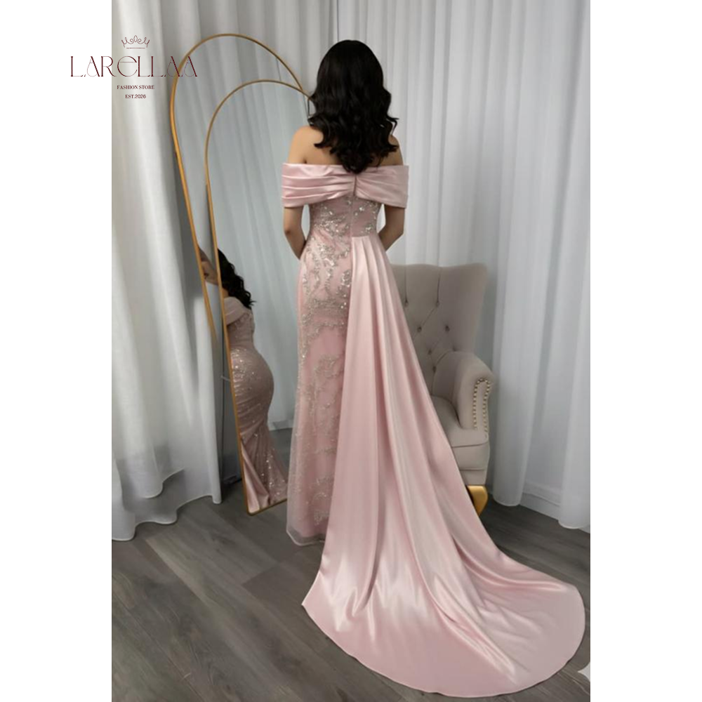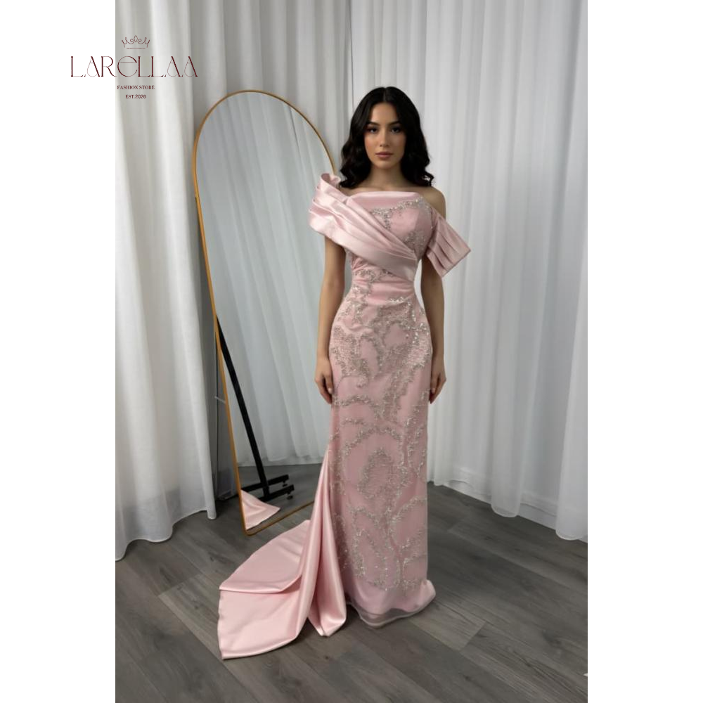 فستان سهرة تفته استرتش بكلفة مطرزة من larellaa، يتميز بتصميم أنيق مع تفاصيل تطريز رائعة وذيل طويل يمنحك إطلالة مدهشة في جميع المناسبات الخاصة.