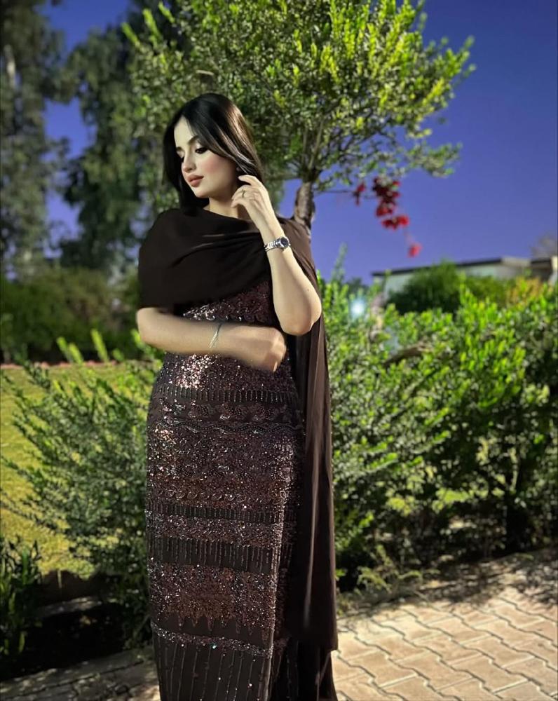 • يزدان التصميم بتطريز شك كثيف يغطي كامل الفستان ليعكس الأضواء ويمنحك توهجاً لافتاً في كل سهرة.