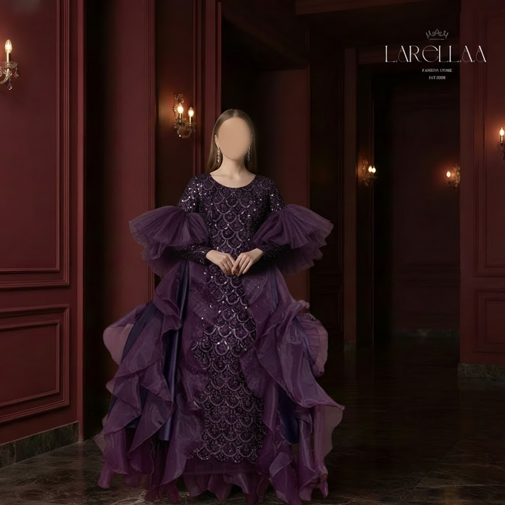 فستان سهره بنفسجي من larellaa يتميز بتصميم فاخر من الأورغنزا البنفسجي المزين بالخيوط اللامعة وأكمام منفصلة، ليمنحكِ إطلالة مميزة وفخمة في كل مناسبة.