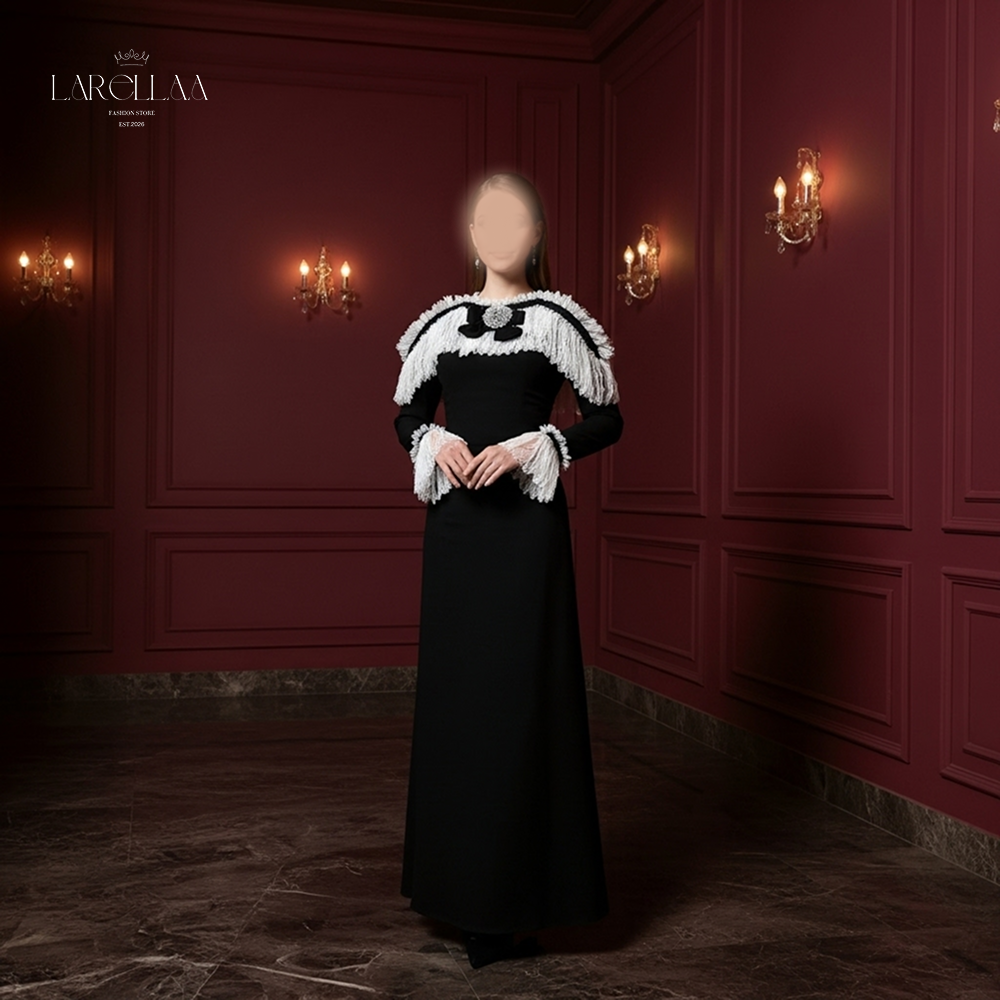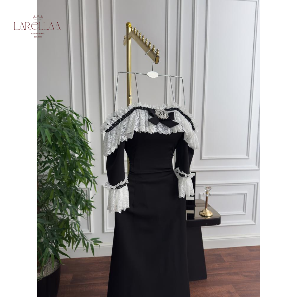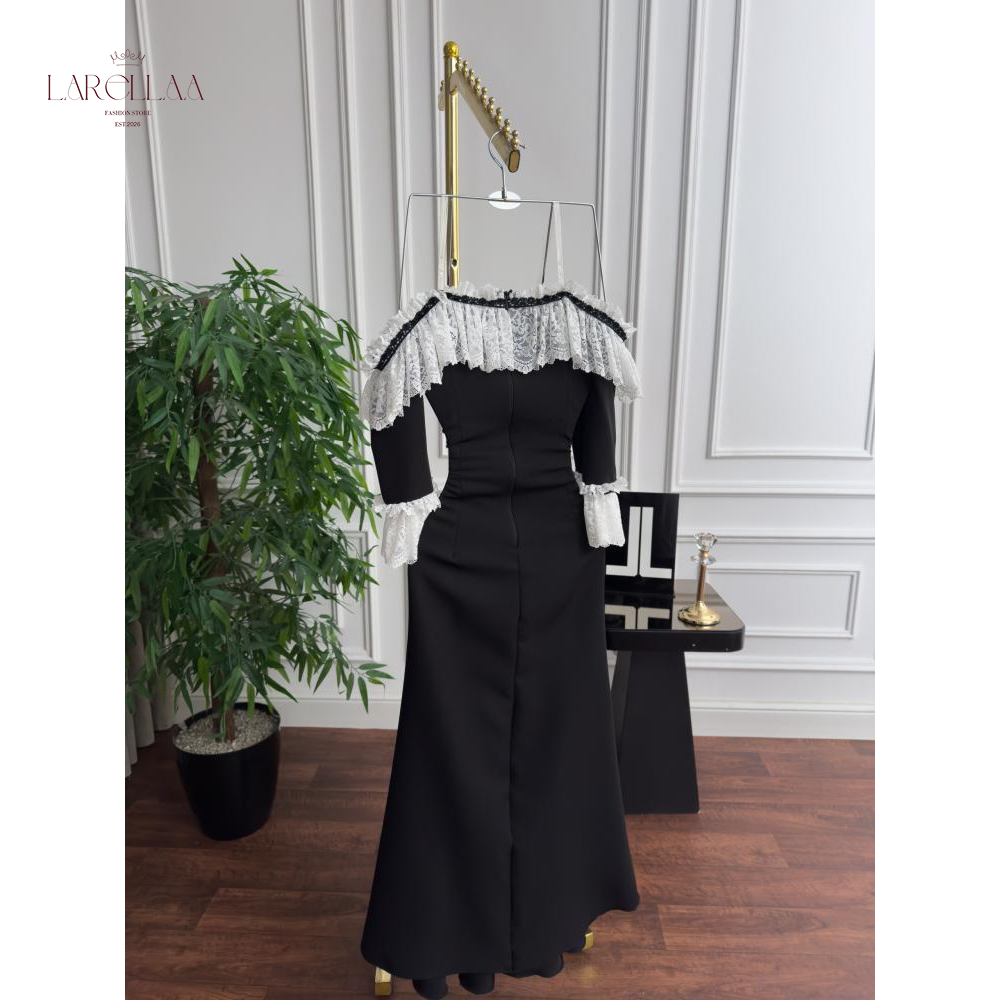 فستان طويل اسود من larellaa. صُمم هذا الفستان ليمنحكِ مظهراً راقياً ومتميزاً، حيث تبرز تفاصيل الدانتيل جمال التصميم وتضفي عليه لمسة أنثوية ساحرة تناسب أرقى السهرات.