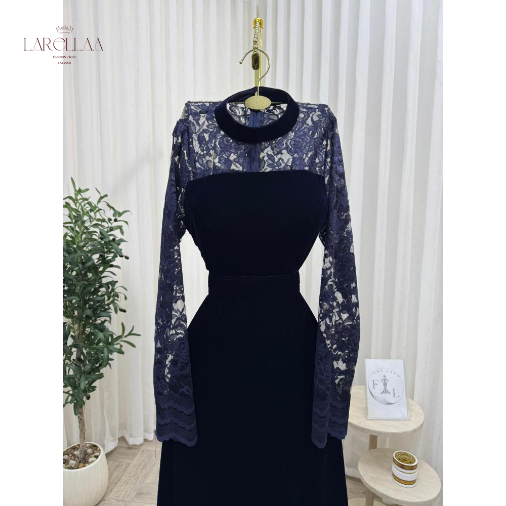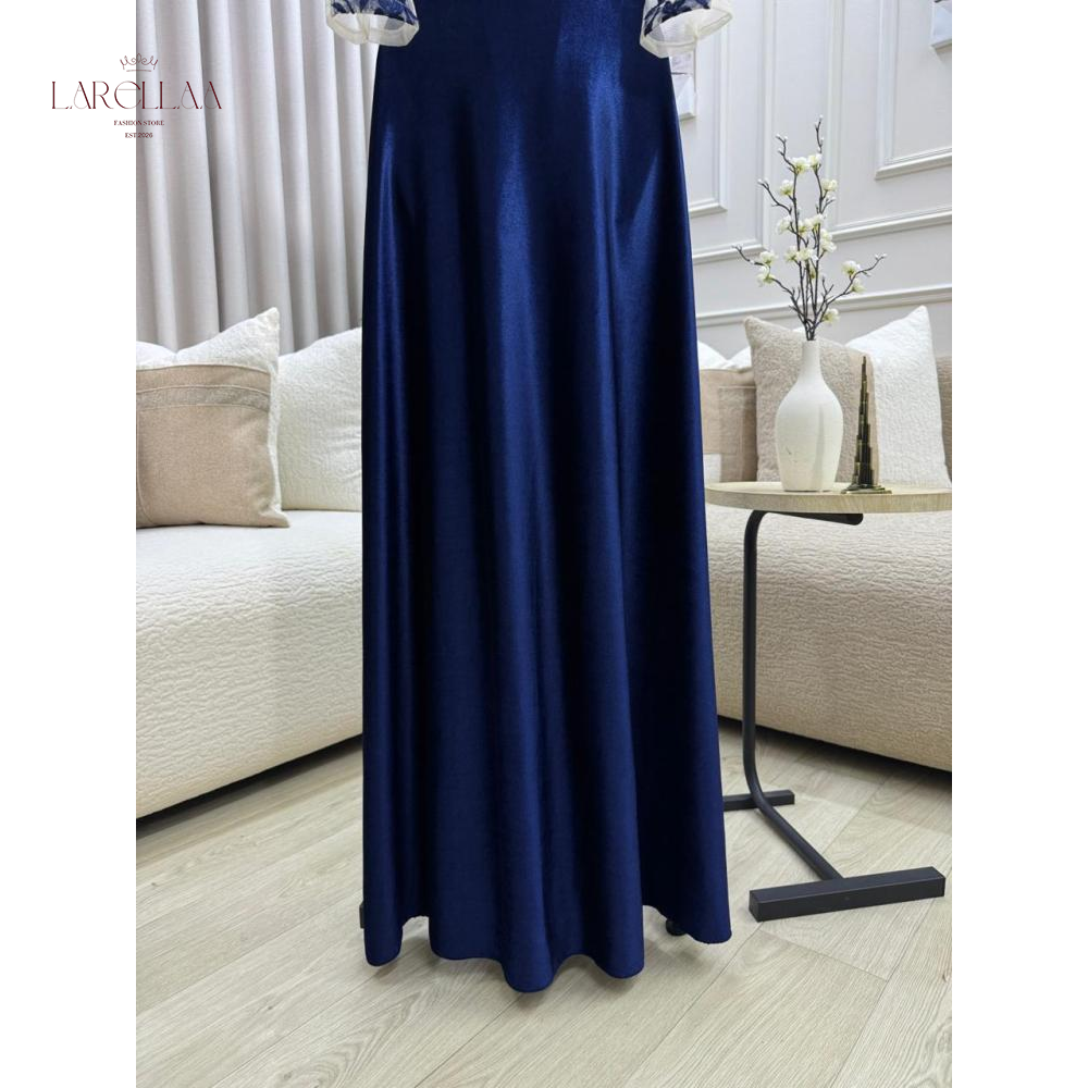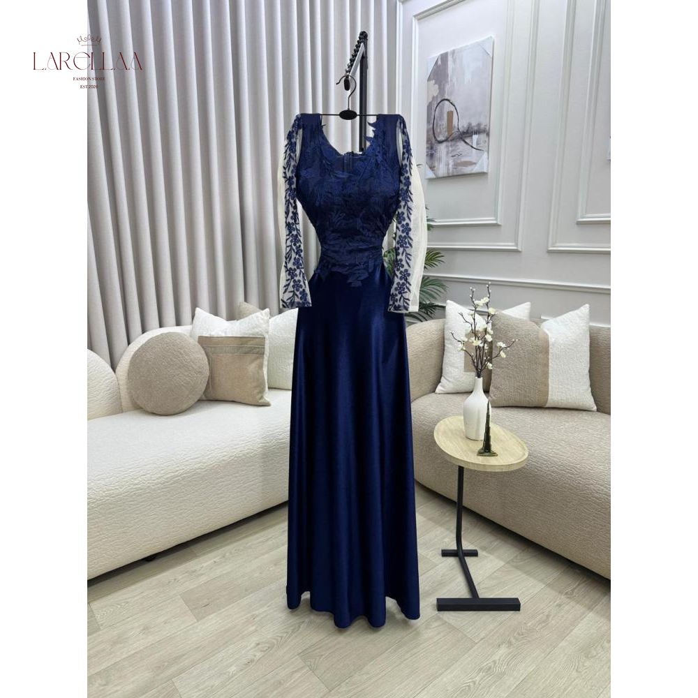 فستان كحلي مخمل من larellaa. بفضل فتحة الرقبة الأنيقة والأكمام الشفافة المزينة بالتطريز اليدوي، ستكونين النجمة المتألقة في أرقى السهرات والمناسبات الرسمية.