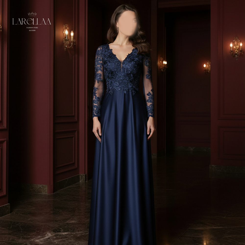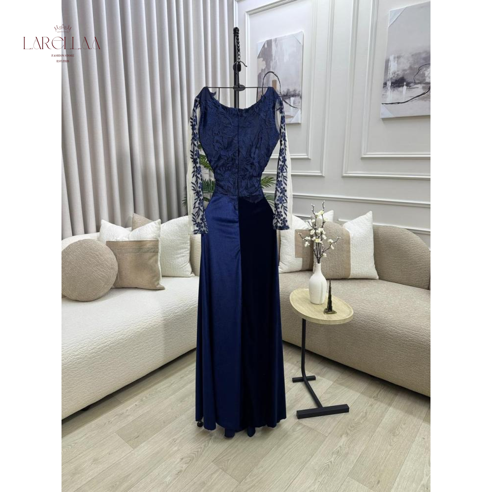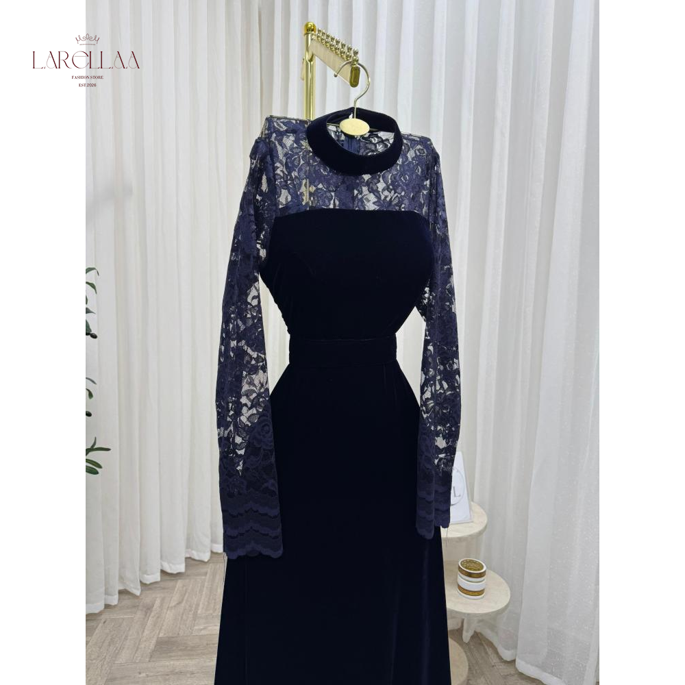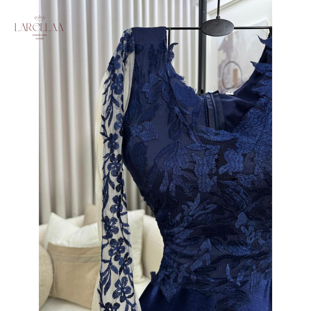 فستان كحلي مخمل من larellaa. بفضل فتحة الرقبة الأنيقة والأكمام الشفافة المزينة بالتطريز اليدوي، ستكونين النجمة المتألقة في أرقى السهرات والمناسبات الرسمية.
